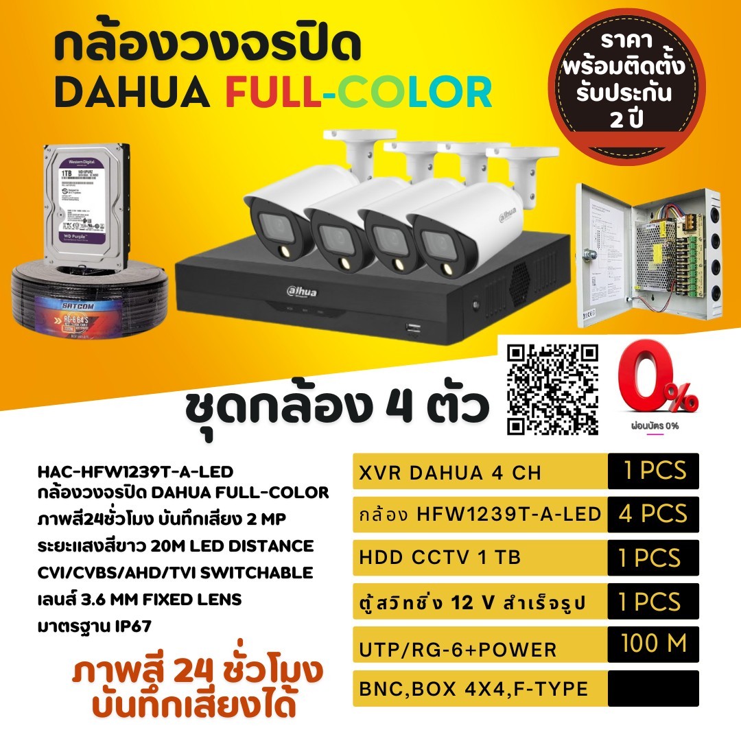ชุดกล้องวงจรปิดDAHUAพร้อมติดตั้ง 4 ตัว ประกอบไปด้วย XVR DAHUA 4CH 1 ตัว กล้องอนาล็อก HFW1239T-A-LED 4 ตัว HDD CCTV 1 TB 1 ตัว ตู้สวิทชิ่ง 12Vสำเร็จรูป 1 ตัว UTP/RG-6+POWER 100 เมตร HAC-HFW1239T-A-LED กล้องวงจรปิด DAHUA FULL-COLOR ภาพสี24ชั่วโมง บันทึกเสียง 2 MP ระยะแสงสีขาว 20M LED DISTANCE CVI/CVBS/AHD/TVI SWITCHABLE เลนส์ 3.6 MM FIXED LENS มาตรฐาน IP67