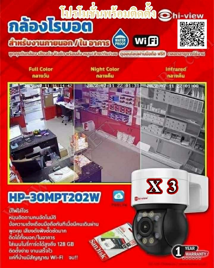 ชุดกล้องวงจรปิดHiviewพร้อมติดตั้ง 3 ตัว ประกอบไปด้วย กล้องRobot HP-30MPT202W 3 ตัว เมมโมรี่การ์ด 32GB 3 ตัว ชุดติดตั้ง 3 ชุด สายไฟ 10เมตร 3 ชุด
