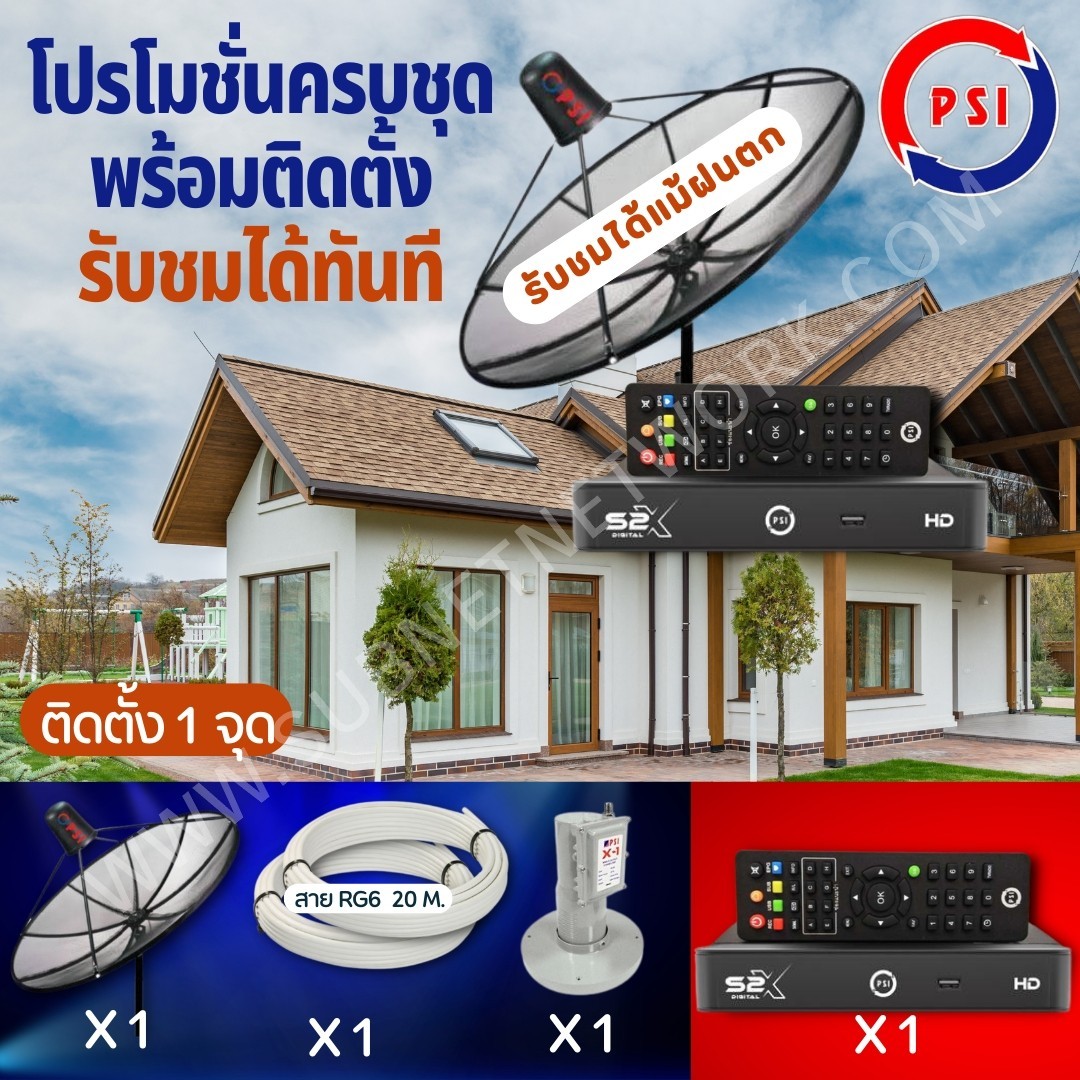 ชุดจานดาวเทียมS2พร้อมติดตั้ง 1จุด(C BAND) ประกอบไปด้วย จานดำโปร่ง PSI 1.5 เมตร 1 ชุด หัวLNB 1 ขั้ว 1 หัว สายสัญญาณ RG6 20 เมตร 1 ขด กล่องรับสัญญาPSI S2X 1 กล่อง+DD6:D13