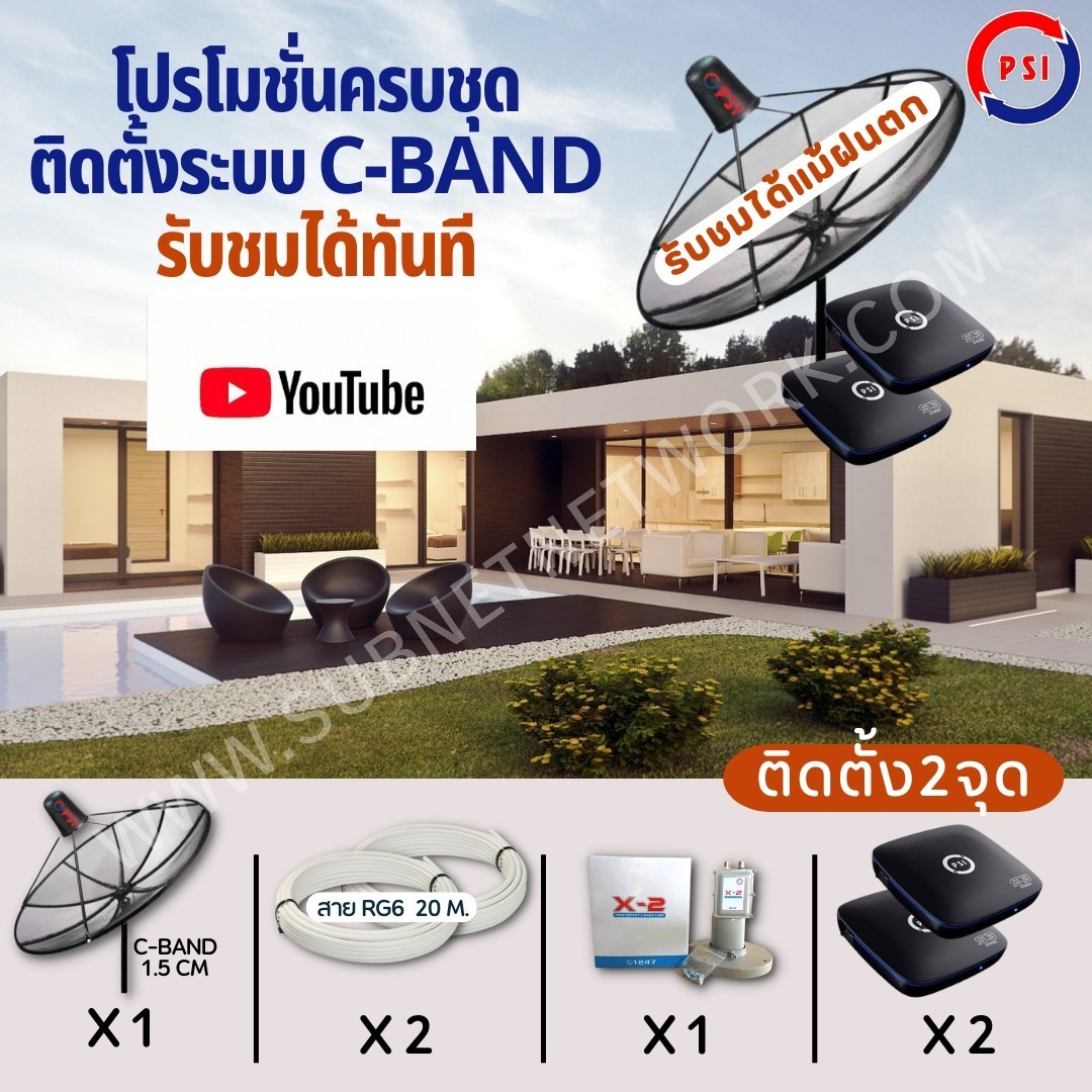 ชุดจานดาวเทียมS3พร้อมติดตั้ง 2จุด(C BAND) ประกอบไปด้วย จานโปร่ง 1 ชุด หัวฟีตรับสัญญาณ 1 หัว สายสัญญาณ RG6 20 เมตร 2 ขด กล่องรับสัญญาณS3 2 กล่อง