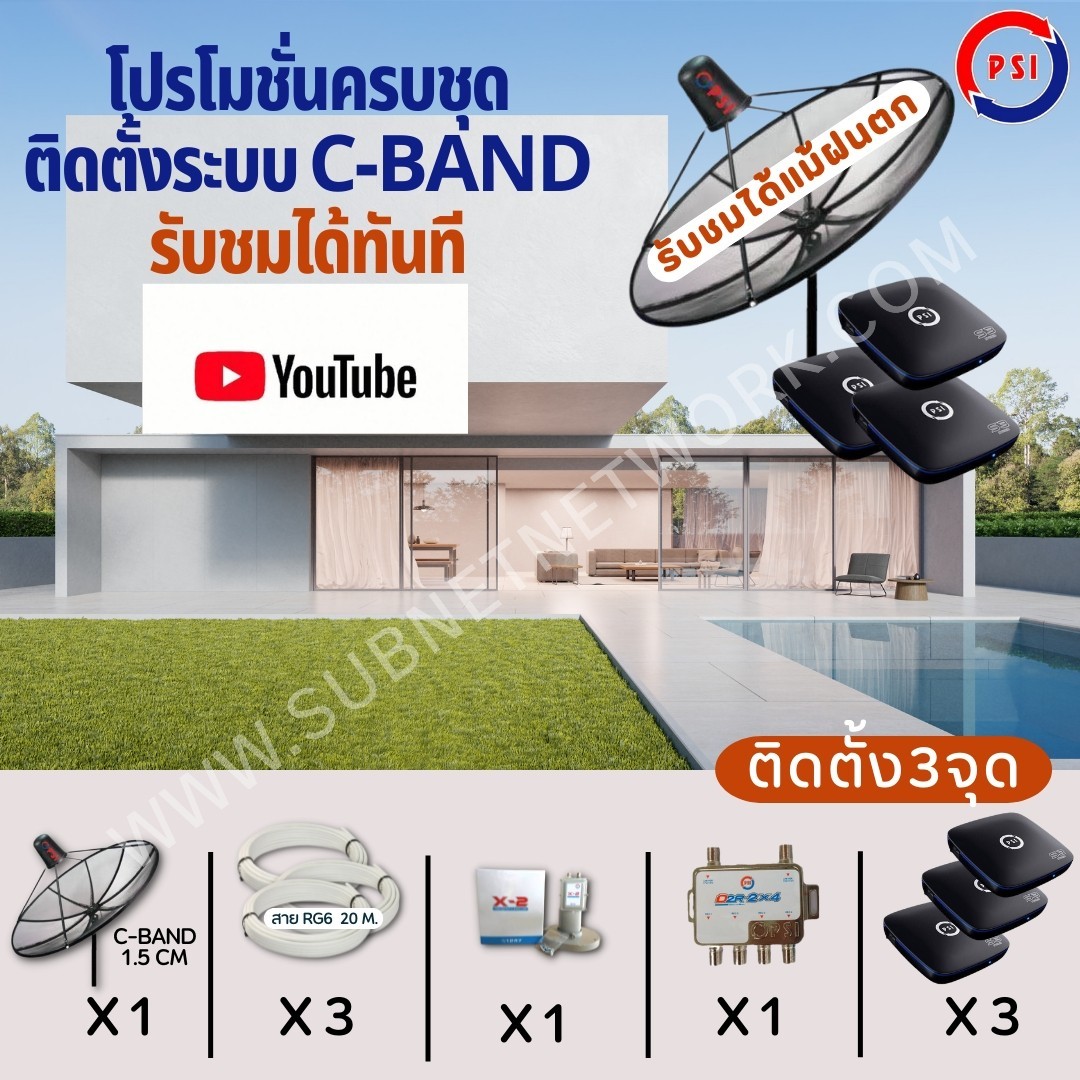 ชุดจานดาวเทียมS3พร้อมติดตั้ง 3จุด(C BAND) ประกอบไปด้วย จานโปร่ง 1 ชุด หัวฟีตรับสัญญาณ 1 หัว สายสัญญาณ RG6 20 เมตร 3 ขด กล่องรับสัญญาณS3 3 กล่อง ตัวแยกสัญญาณ 1 ตัว