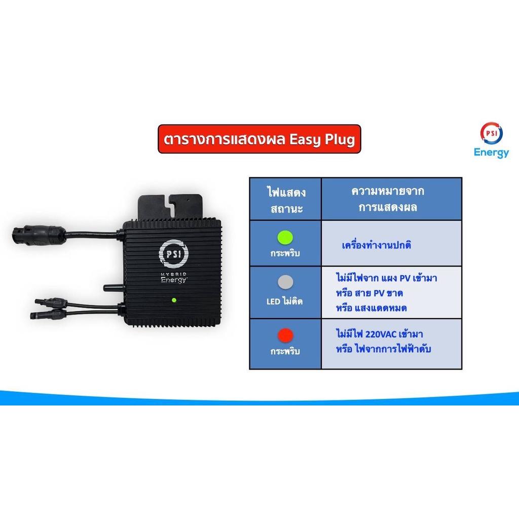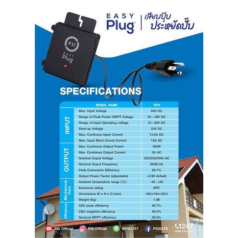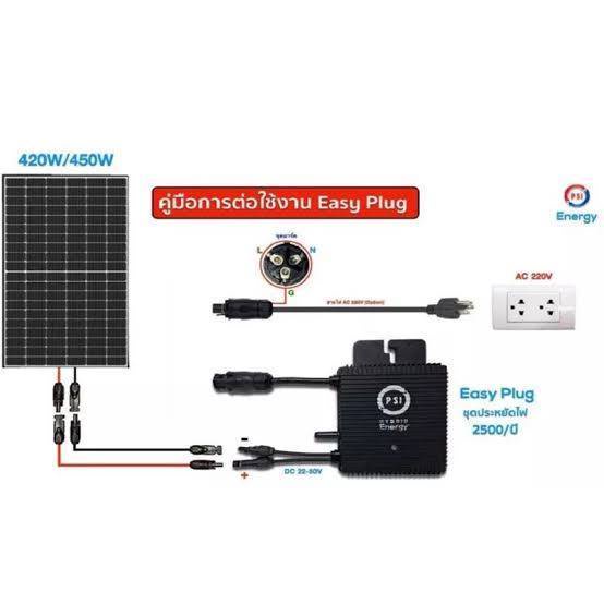 ชุด easy plug PSI micro inverter ongrid 400w ติดตั้งง่าย ประหยัดไฟ สำหรับลูกค้าที่มีแผงโซล่าเซลล์อยู่แล้ว ประกอบไปด้วย easy plug PSI 1 ชิ้น Smart plug PSI 1 ชิ้น สาย PV 4sqmm สีแดง-ดำ เส้นละ 5 เมตร หัวMC4 4 หัว ประกันศูนย์ PSI 5ปี เริ่มต้นทำงาน1 แผง