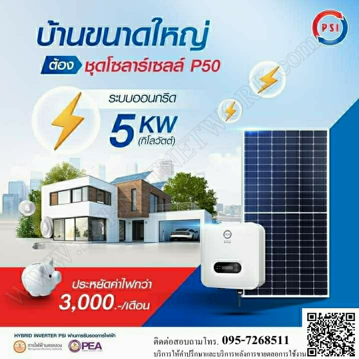ชุดโซลาร์เซลล์พร้อมติดตั้ง ขนาด 5 กิโลวัตต์ ประกอบไปด้วย แผง 520W(Mono) 12 ตัว Solar Inverter รุ่uP50 1 ตัว ชุดกล่องคอนโทรลPC50 1 ตัว Mid Clamp 22 ตัว L-Feet 12 22 ตัว End Clamp(4mm) 4 ตัว Rall Splice 6 ตัว Ground Lug 2 ตัว แท่งกราวด์ชุบทองแดง 1 ตัว รางอลูมิเนียม 4.2เมตร 7 ตัว
