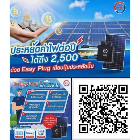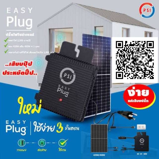 แผงโซล่าเซลล์ชุด Easy Plug PSI แผงโซล่าเซลล์ MONO Half Cell 380W. ชุดประหยัดไฟ แผ่นMONO Half Cell 380W. 1แผ่น ชุด Easy Plug 1 ชุด ขายึดจับอุปกรณ์ 4 ชุด สาย PV 4 sqmm สีแดง-ดำ เส้นละ 10เมตร หัวMC4 4 หัว ประหยัดไฟ 2,500 บาท/ปี